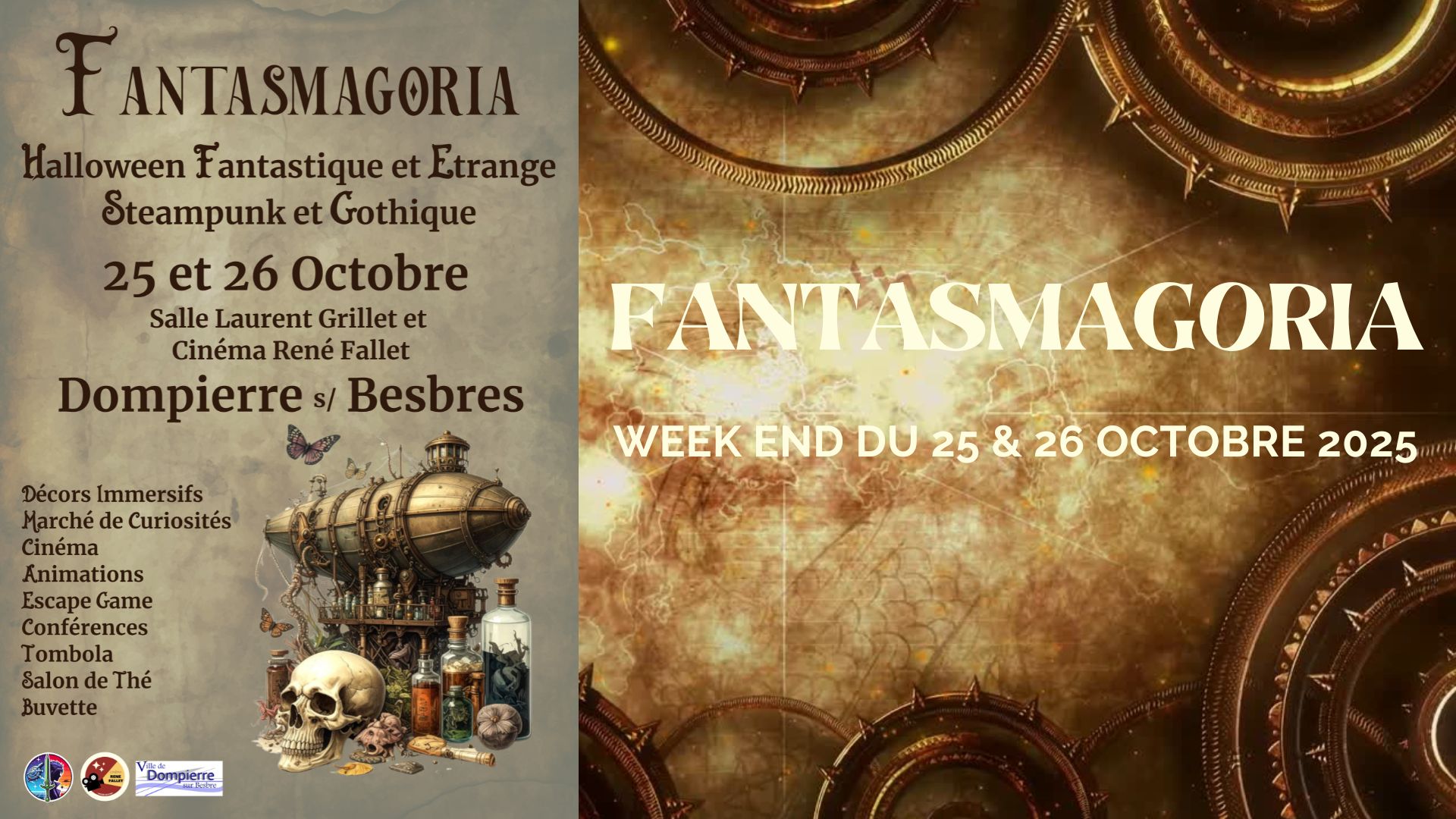 Bienvenue dans l’univers envoûtant de Fantasmagoria ! Plongez dans une ambiance hors du temps, où le gothique chic et le steampunk se rencontrent pour une célébration unique du fantastique et de l’étrange. Décors immersifs, films en salle de cinéma, marché de curiosités, exposition, conférences, escape game, concours cosplay, tombola, buvette... Que vous soyez amateur de mystères victoriens, d’automates raffinés ou de contes gothiques, Fantasmagoria vous invite à une expérience inoubliable où le rêve et l’étrange s’entrelacent dans une atmosphère ensorcelante. Venez vivre un moment hors du commun et laissez la magie opérer ! Les films projetés : SAMEDI 25 OCTOBRE L'étrange Noël de Mr Jack à 16h30 The Lighthouse en vostfr à 18h00 Hugo Cabret en 3D à 20h00 Mortal Engines à 22h30 DIMANCHE 26 OCTOBRE L'étrange Forêt de Bert et Josephine à 10h30 Les noces funèbres à 14h30 Edward aux mains d'argent à 16h00 Giorgino à 18h00 ... Les exposants (liste encore incomplète) : Chine et chic La cave des druides Shadow side seeing Gaia Terremer Le jardin de clochette La bête à cornes Witche and Viking Mora L'atelier d'Yggdrasil MCB Création Chris Wood Fantalunaa Vibrazen création