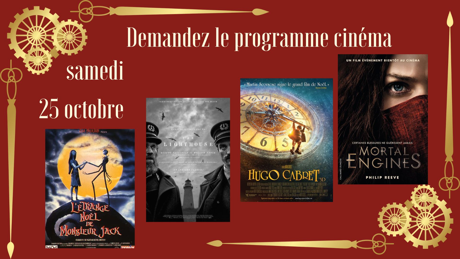 Voici le programme complet du samedi pour le cinéma avec des références du Steampunk et du Gothique. 16h30 L'ETRANGE NOEL DE MR JACK Venez voir ou redécouvrir ce merveilleux contes pour toute la famille 18h00 THE LIGHTHOUSE en vostfr Le film réalisé par Robbert Eggers (The Witch, Nosferatu, The Northman) vous est de nouveau proposé. Un noir et blanc somptueux pour une oeuvre inspiré de Lovecraft avec deux numéros d'acteur grandioses de Willem Dafoe et Robert Patinson 20h00 HUGO CABRET en 3D Oui, vous avez bien vu, on ne pouvait pas ne pas vous passer le chef d'oeuvre de Martin Scorsese puisque ce film est pile dans la thémathique du festival. En prime, on vous le propose en 3D sans supplément. 22h30 MORTAL ENGINES Boudé à sa sorti, le film mis en place par James Cameron et Peter Jackson trouve toute sa place dans l'unvivers Steampunk de FANTASMAGORIA. Profitez en pour le découvrir en salle, c'est toute une aventure.