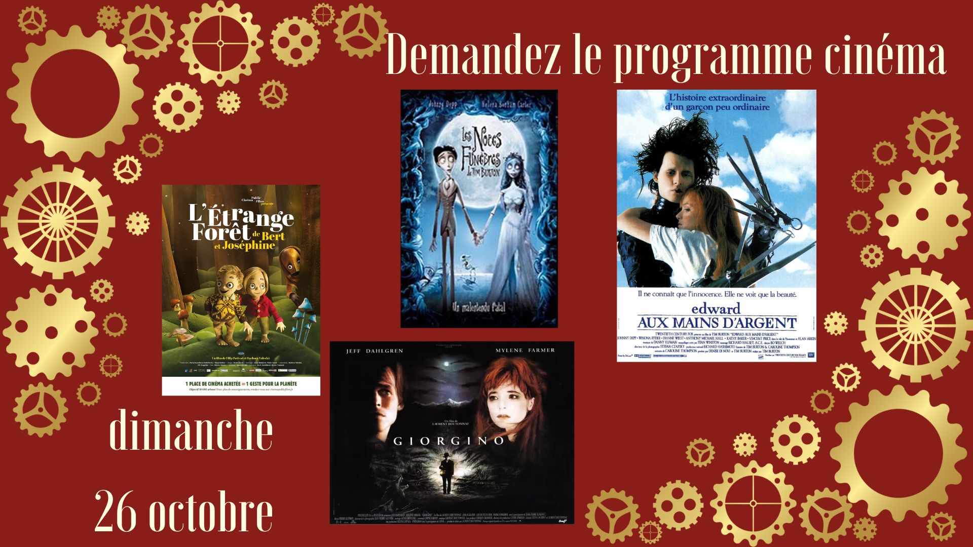 La deuxième journée de FANTASMAGORIA au cinéma est grandement dédié à l'univers de Tim Burton. Après vous avoir proposé la veille Mr Jack, voici la suite des festivités. 10h30 L'ETRANGE FORET DE BERT ET JOSEPHINE Pour démarrer la journée, et surtout paerce que l'on pense également aux plus petits, voici un programme d'aventure tout en poésie que n'aurait pas renié Tim Burton 14h30 LES NOCES FUNEBRES On repart sur le deuxième chef d'oeuvre d'animation de Tim Burton avec ce magnifique film. 16h00 EDWARD AUX MAINS D'ARGENT Toute la poésie, l'humour, la tendresse qui caractérise le cinéma de Tim Burton est dans ce film à redécouvrir de toute urgence. 18h00 GIORGINO On termine le week-end avec la reine du Spleen. Mylène Farmer est à l'affiche du film de son Pygmalion d'alors Laurent Boutonnat pour un film d'aventure mélancolique digne de son talent.