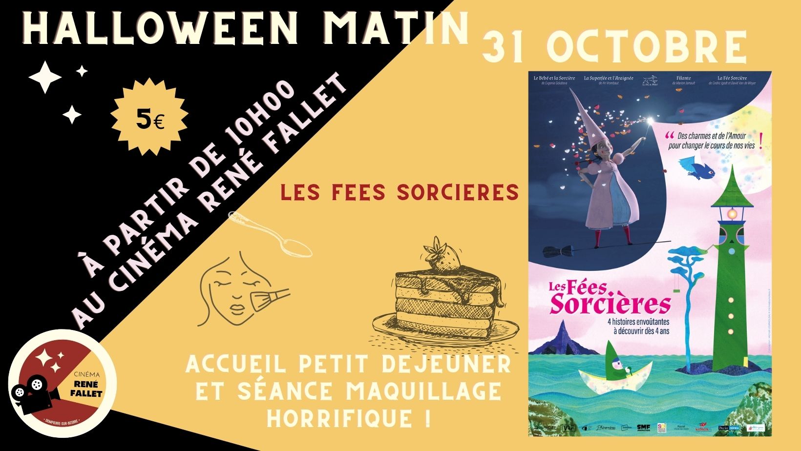 HALLOWEEN MATIN c'est quoi ? Pour 5€ seulement, tarif unique par personne, venez à partir de 10h00 prendre le petit déjeuner à nos côtés, faire maquiller vos enfants et découvrir le programme jeunesse Halloween pour les tout-petits qui ne fait pas si peur que ça. LES FEES SORCIERES projection à 11h00 Il était une fois deux fées et deux sorcières qui ne se connaissent pas et... qui ne se rencontreront jamais. Pourtant le hasard de la vie va les réunir autour d’un même chemin : partir à la conquête de leur destin, apprendre à mieux se connaître et découvrir l’autre.