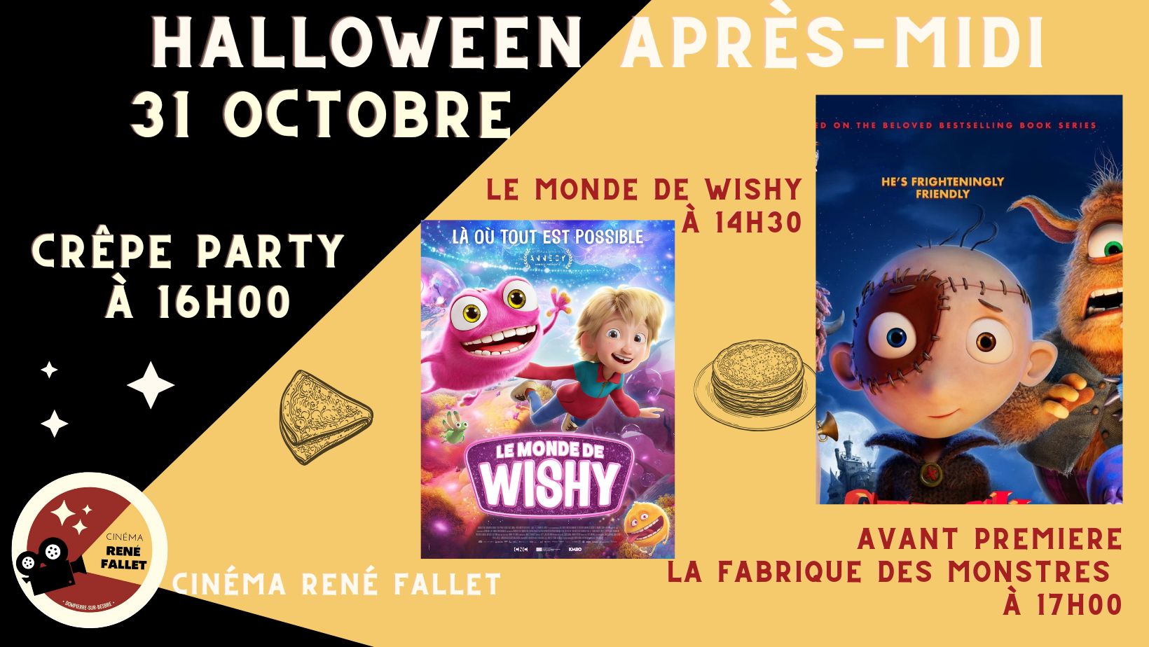 HALLOWEEN KIDS c'est quoi ? 2 films et Crêpe Party avec chocolat confiture, etc... 14h30 LE MONDE WISHY Quand Thomas rencontre Wishy, une petite boule de poils venue d’un univers magique, sa vie bascule. Dans ce royaume merveilleux peuplé de créatures fantastiques, il peut remarcher, et même voler ! Mais lorsque le portail entre les mondes libère un monstre, Thomas et son nouvel ami vont devoir partir à l’aventure pour sauver leurs deux univers. 16h00 Gouter avec des crêpes en veux tu en voilà ! 17h00 LA FABRIQUE DES MONSTRES Le film ne sort qu'en décembre et vous est proposé en AVANT PREMIERE, pas mal non... Dans le vieux château de Grotteskew, un savant fou fabrique, rafistole, et invente sans cesse des monstres farfelus. Stitch Head, sa toute première création, petit être étrange composé de pièces détachées, et oublié avec le temps, sert de guide aux nouvelles créations de son maitre. Jusqu’au jour où un cirque débarque en ville… À la recherche d'une nouvelle attraction, son propriétaire Fulbert Freakfinder tente par tous les moyens d'accéder à cette fabrique de monstres. Stitch Head pourrait bien être la future star de son spectacle...