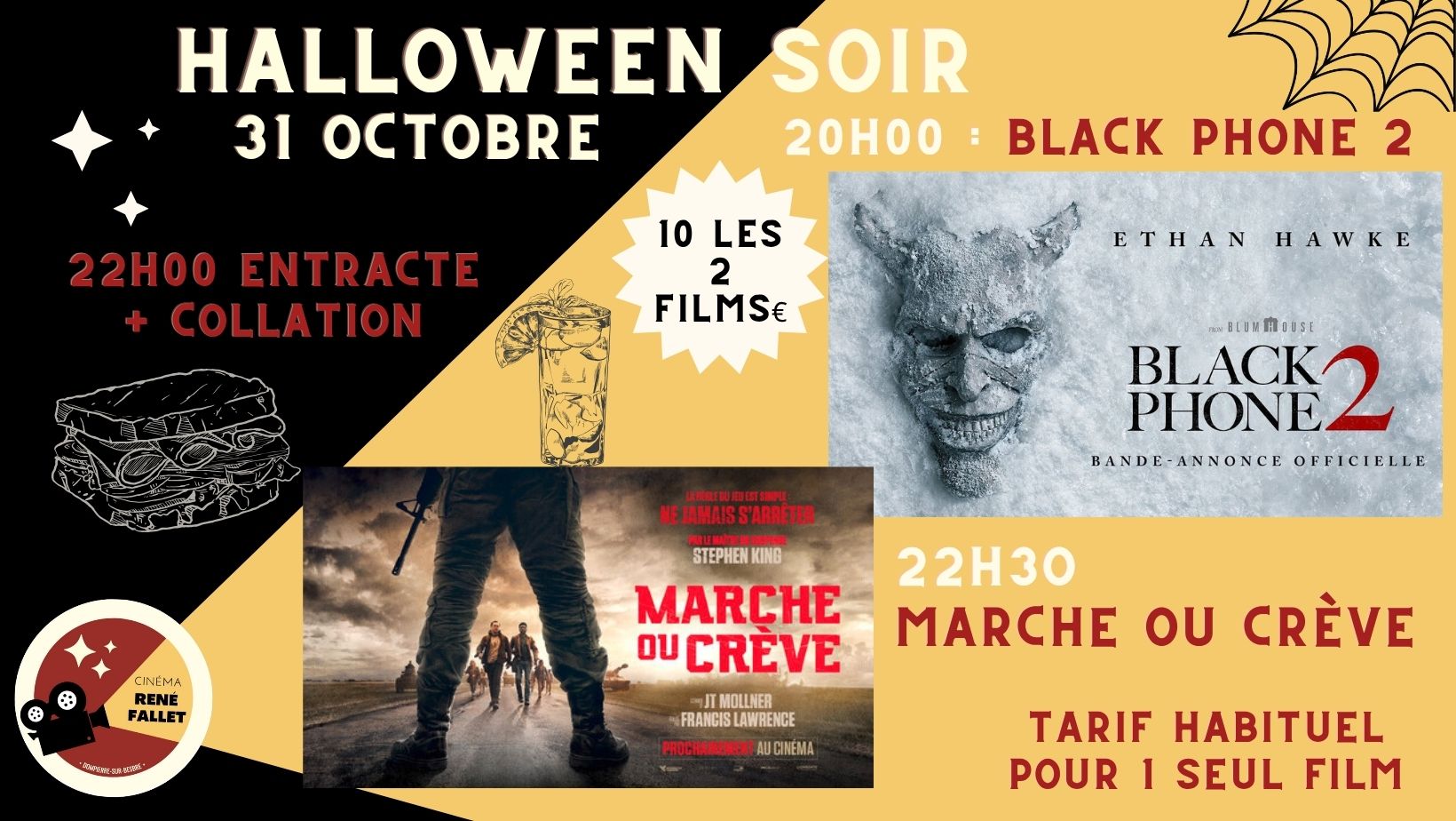 Le soir, fais toi peur avec les deux films de la selection. Pour 10€ seulement, tu pourras mater les deux film, boire une coup entre et faire un petit grignotage pour reprendre des forces. 20h00 BLACK PHONE 2 Interdit - 16 ans Depuis son enlèvement, Finney, aujourd’hui âgé de 17 ans, éprouve beaucoup de mal à reprendre le cours d’une vie normale, alors que rien ni personne ne saurait arrêter Gwen, sa sœur de 15 ans. Mais le sinistre téléphone se met à sonner dans les rêves de l’adolescente, où elle voit sans cesse trois garçons se faire pourchasser dans un camp de montagne appelé Alpine Lake. Déterminée à mettre fin à ces cauchemars et à en percer le mystère, Gwenn persuade son frère de se rendre sur place, malgré le blizzard qui frappe la station. C’est là qu’elle découvre l’horrible vérité derrière le lien entre l’Attrapeur et sa propre famille. Les deux adolescents vont alors devoir affronter un tueur que la mort a rendu presque invincible et à qui leurs destins sont beaucoup plus liés qu'ils n’auraient pu l’imaginer. 22h00 COLLATION au Cinéma 22h30 MARCHE OU CREVE Le dernier film adapté de Stephen king Interdit - 16 ans Le jeune Garraty va concourir pour " La Longue Marche ", une compétition qui compte cent participants. Cet événement sera retransmis à la télévision, suivi par des milliers de personnes. Mais ce n’est pas une marche comme les autres, plutôt un jeu sans foi ni loi…