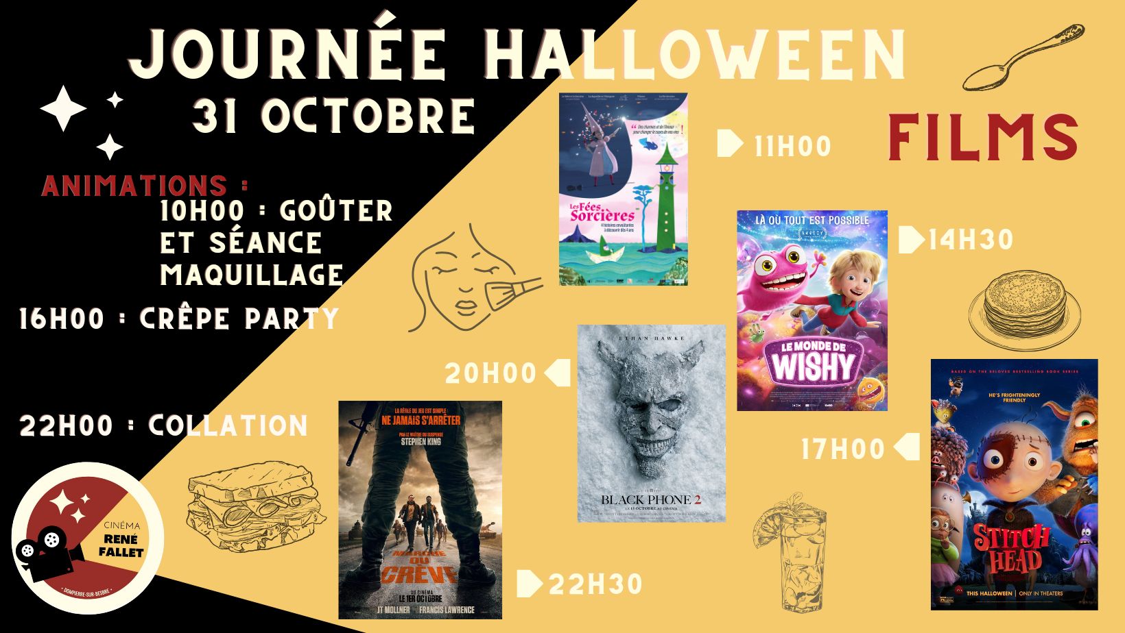 La traditionnelle journée d'Halloween au cinéma est de retour ce 31 octobre. Au programme, accueil des plus jeunes le matin avec petit déjeuner et séance de maquillage suivi du programme jeunesse LES FEES SORCIERES. L'après midi HALLOWEEN KIDS vous propose deux films d'animation LE MONDE DE WISHY à partir de 6 ans et en Avant Première LA FABRIQUE DES MONSTRES à partir de 8 ans. Entre les deux, on vous propose un gouter CREPE PARTY, miam miam. Pour terminer, on n'a pas oublié les plus grands puisque l'on vous propose une SOIREE HALLOWEEN avec BLACK PHONE 2 (interdit au moins de 12 ans) tout juste sorti en salle et le dernier Stephen King MARCHE OU CREVE (interdit aux moins de 16 ans). Bien entendu, entre les deux une collation vous sera offerte. Venez déguisé, la fête n'en sera que plus belle !