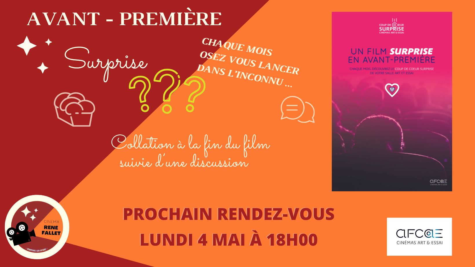 Le lundi 4 mai à 18h00, laissez-vous tenter par une séance pas comme les autres au Cinéma René Fallet 🎬 Venez découvrir le Coup de Cœur Surprise AFCAE, un film en avant-première… dont le titre reste secret jusqu’à l’instant où la lumière s’éteint ! Une occasion unique de vibrer, d’être ému, surpris, conquis — bref, de retrouver le plaisir du cinéma comme au premier jour. Et parce qu’un bon film se savoure encore mieux ensemble, la projection sera suivie de notre traditionnel apéritif dînatoire de l’amitié, un moment convivial pour échanger, partager vos impressions et prolonger la magie. 🎥 Une surprise sur grand écran 🥂 Un moment chaleureux à partager 📅 Lundi 4 mai – 18h00 On vous attend nombreux pour cette belle soirée cinéma !