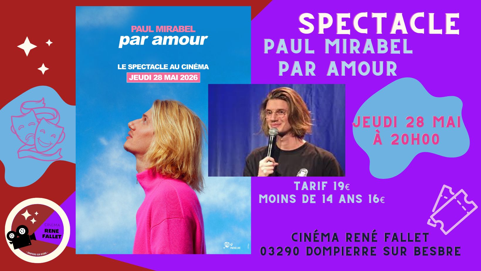 Paul Mirabel – Par amour : le spectacle au cinéma Sa tournée actuelle affichant complet, dont 40 Zéniths et 2 Accor Arena à Paris, Paul Mirabel vous offre une ultime occasion de rire avec lui le jeudi 28 mai à 20h00, lors d’une séance unique, exclusivement dans votre cinéma rené Fallet. Tarif 19€ et pour les moins de 14 ans 16€ #PaulMirabelAuCinema Billetterie : www.paulmirabelaucinema.com ou https://www.cinemarenefallet.fr/ #PaulMirabelAuCinema Instagram : @paulmirabel / Facebook : @Paul Mirabel