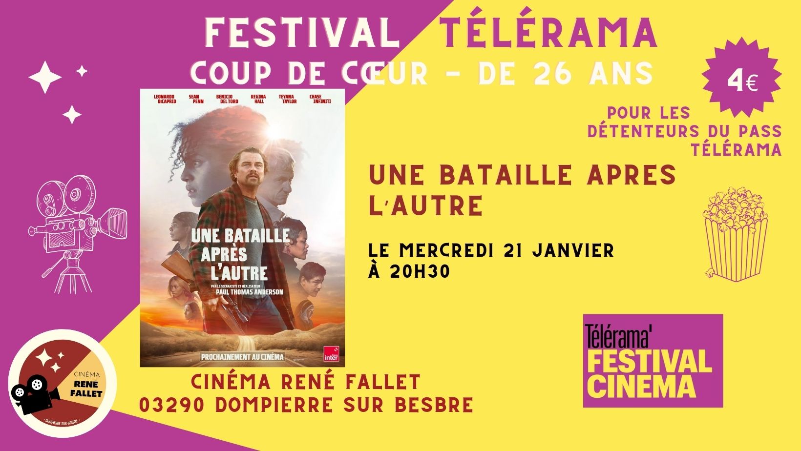 Et si chaque victoire cachait une nouvelle épreuve ? Le film coup de cœur du Festival Télérama 2026, UNE BATAILLE APRÈS L’AUTRE, vous attend pour une séance intense et bouleversante, le mercredi 21 janvier 2026 à 20h30, en VOSTFR, au cinéma René Fallet de Dompierre-sur-Besbre.