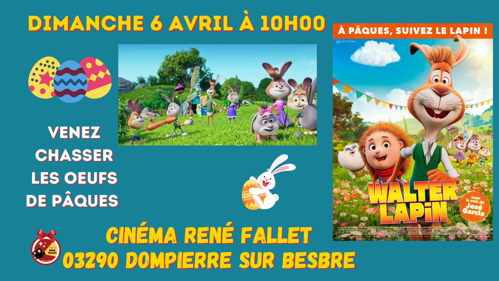 🐰🥚 Le lundi de Pâques, place à la magie au cinéma ! 🥚🐰 Le 6 avril à 10h00, le Cinéma René Fallet invite petits et grands à sa traditionnelle chasse aux œufs… directement dans la salle de cinéma ! Au programme : rires, surprises chocolatées et la projection du film d’animation Walter Lapin pour un moment tendre et plein d’aventures à partager en famille. 🎬🍫 Une matinée festive, gourmande et conviviale à ne surtout pas manquer ! Venez célébrer Pâques autrement… au cinéma ! ✨