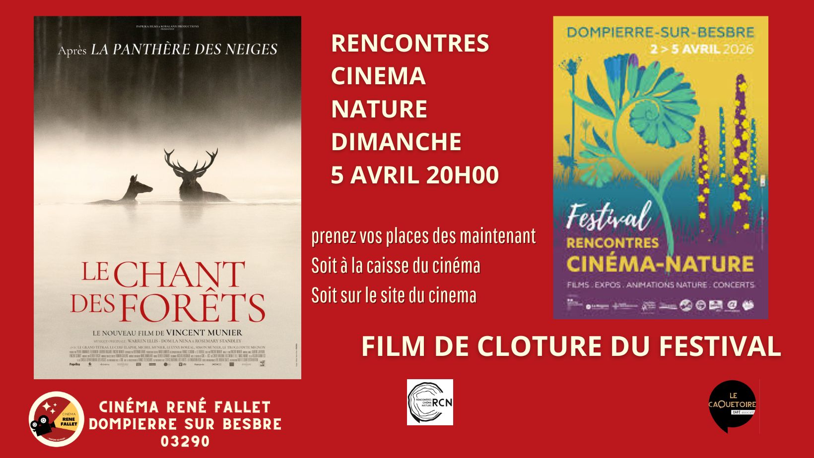 Pour clôturer en beauté le festival Rencontres Cinéma Nature 2026, laissez-vous emporter par une expérience sensorielle et poétique au cœur du vivant. Nous vous invitons à la projection exceptionnelle du film Le Chant des Forêts, une ode vibrante à la nature, où chaque bruissement, chaque souffle, chaque lumière raconte l’histoire fragile et précieuse de nos écosystèmes. Rendez-vous au cinéma René Fallet de Dompierre-sur-Besbre pour un dernier moment de partage, d’émotion et de contemplation. Une soirée pour écouter la forêt… et peut-être, mieux entendre le monde qui nous entoure. 🌿 Une clôture inspirante, à ne pas manquer.