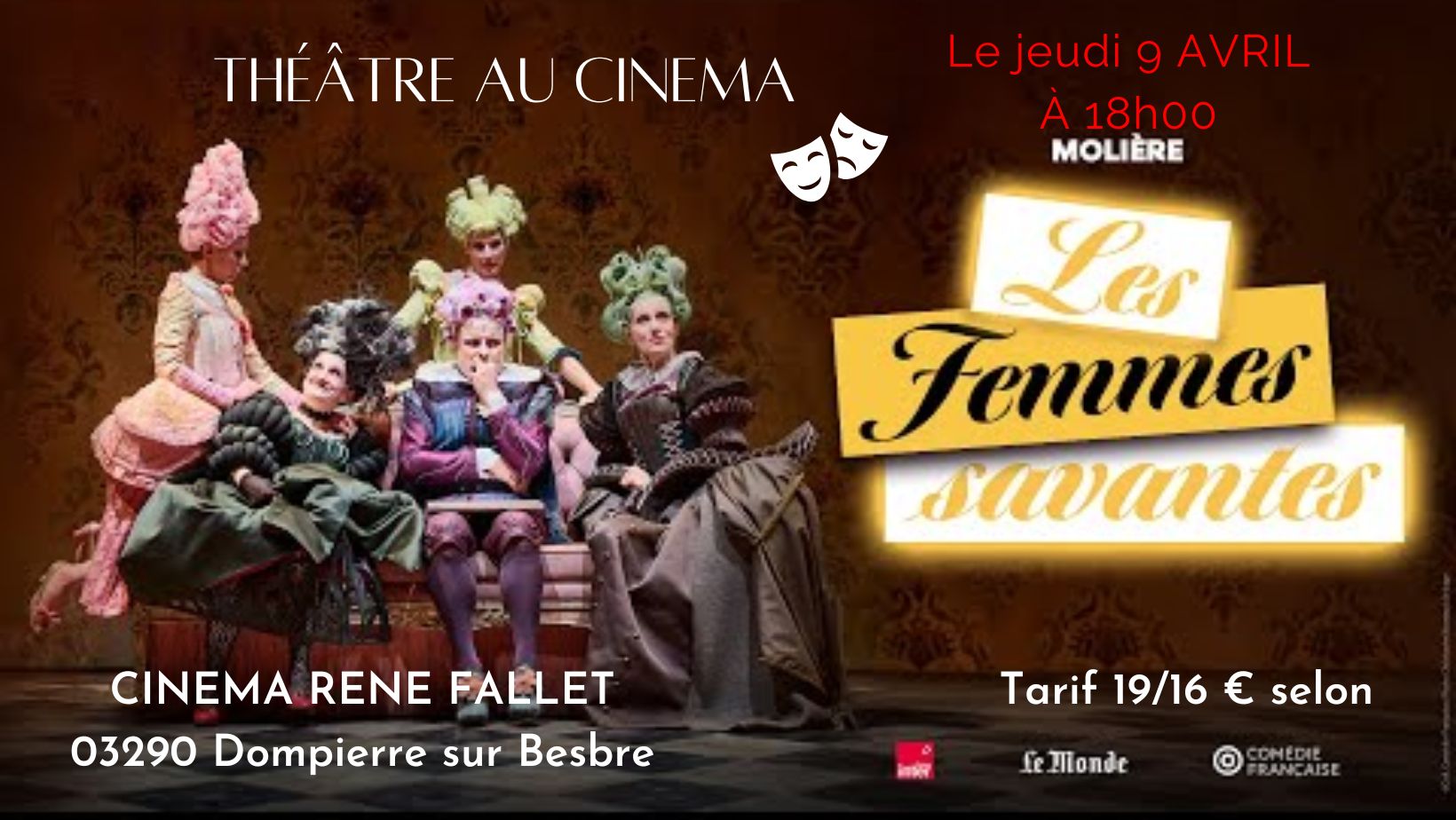 🎭 Et si votre prochaine sortie vous transportait au cœur du théâtre… sans quitter votre fauteuil de cinéma ? Le jeudi 9 avril à 18h00, vivez une expérience unique au cinéma René Fallet de Dompierre-sur-Besbre : la projection de Les Femmes savantes de Molière, captée à la Comédie-Française ! Costumes somptueux, texte brillant, mise en scène moderne… laissez-vous séduire par ce grand classique plein d’humour et de finesse. 🎟️ Tarifs : 19€ / 15€ (réduit) Une soirée culturelle à ne pas manquer, à partager entre amis, en famille… ou simplement pour se faire plaisir ! 👉 Réservez vite vos places et plongez dans la magie du théâtre au cinéma !