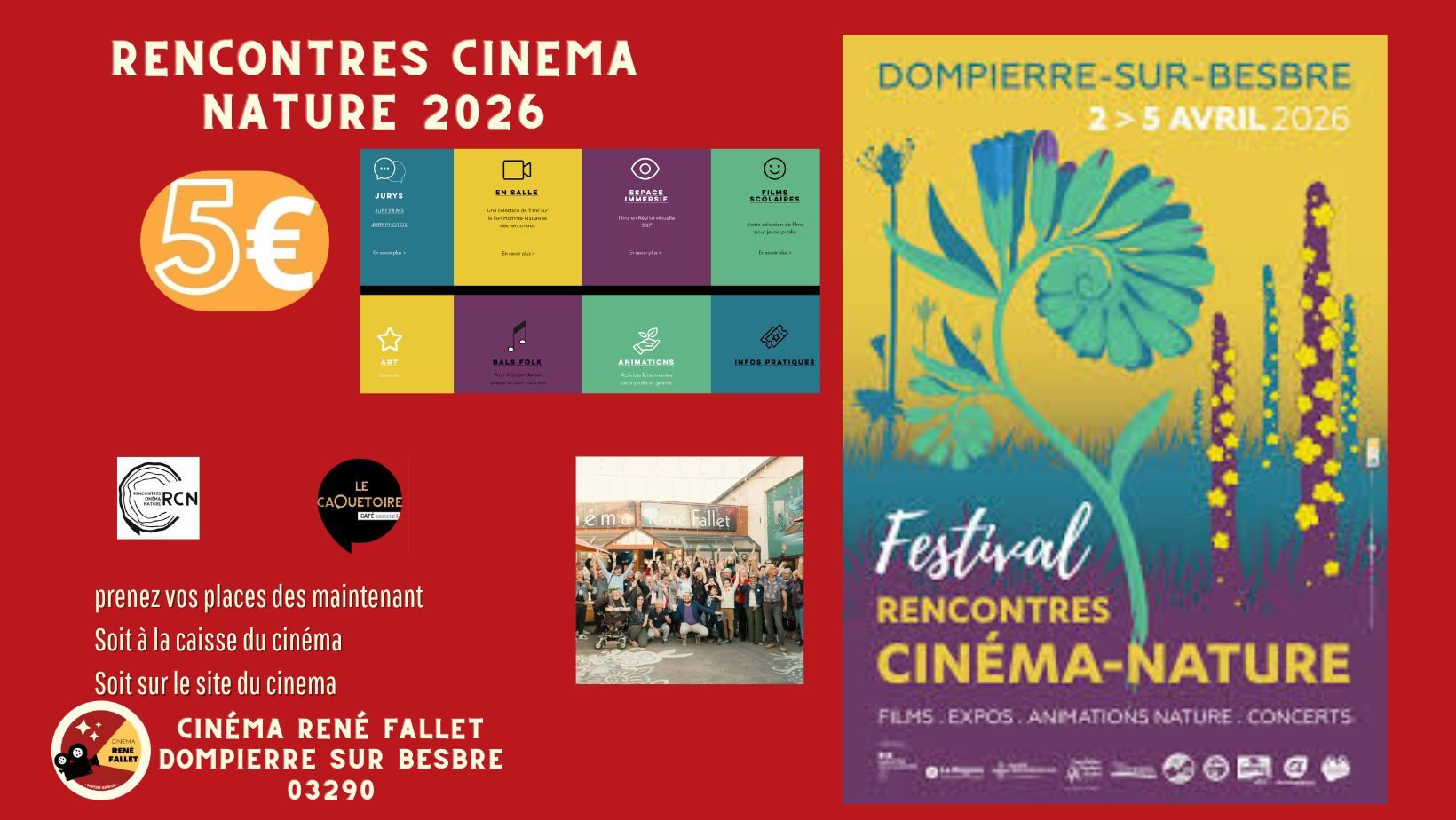 Le 2 avril 2026 à 20:00 Venez voir votre film RCN 2026 HORS COMPETITION 2 Du 2 au 5 avril 2026 DOMPIERRE-SUR-BESBRE Rencontres Cinéma-Nature Le festival vous invite à prendre le temps de la réflexion sur le lien Homme-Nature. Au programme : une compétition de films, une compétition de photographies, des expositions, des concerts, un marché éthique et responsable et de nombreuses animations. Un espace de restauration et de bar propose des produits locaux et écoresponsables. Accès libre au festival séance de cinéma à 5€, billetterie sur place. Organisateur : association Cistudes & Cie, en partenariat avec le cinéma René-Fallet, le café associatif Le Caquetoire et la commune de Dompierre-sur-Besbre.